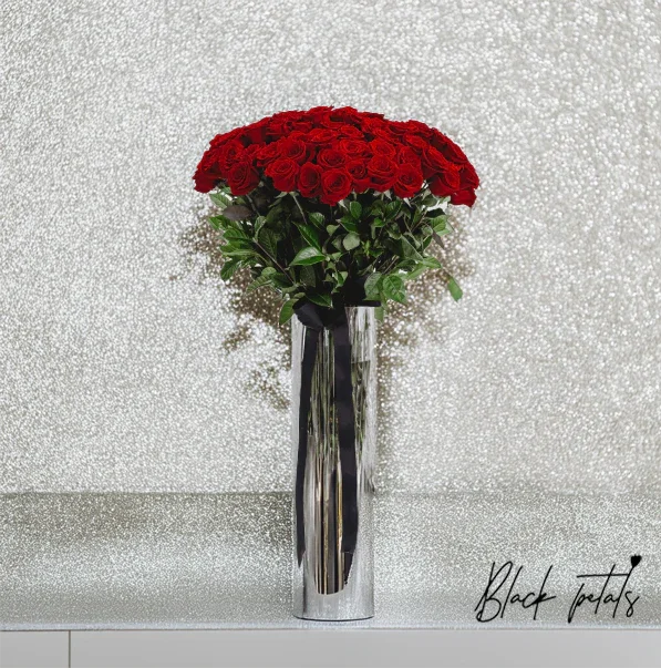 To ensure and guarantee you receive the product, please order at least 3-4 days in advance. Luxurious long-stemmed roses are beautifully arranged in a classic tall crystal vase. The arrangement stands approx. 55 inches tall. Arrangement includes: