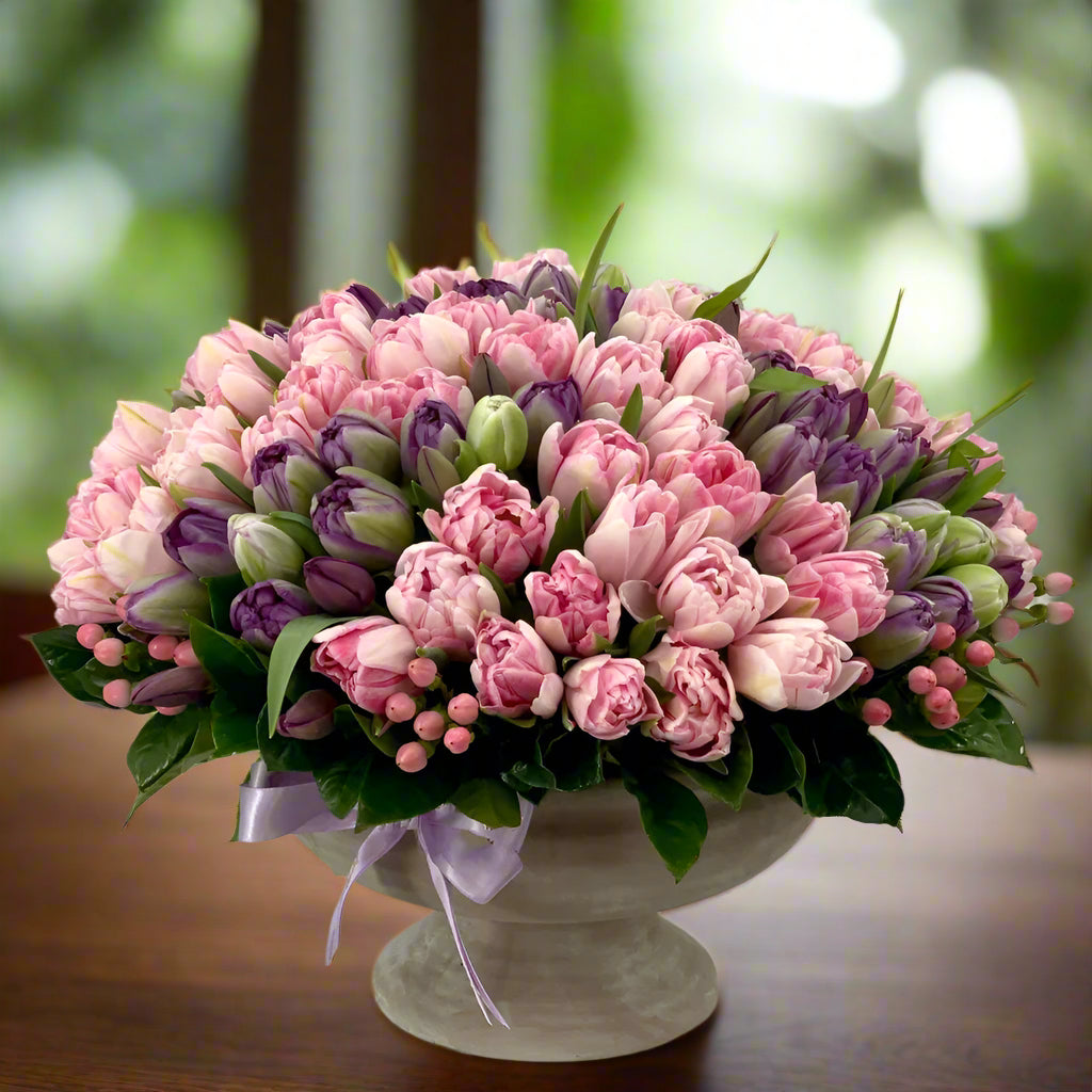 Approximately 120 stems of tulips are awaiting to bloom in this gorgeous BP design. Arrangement includes: