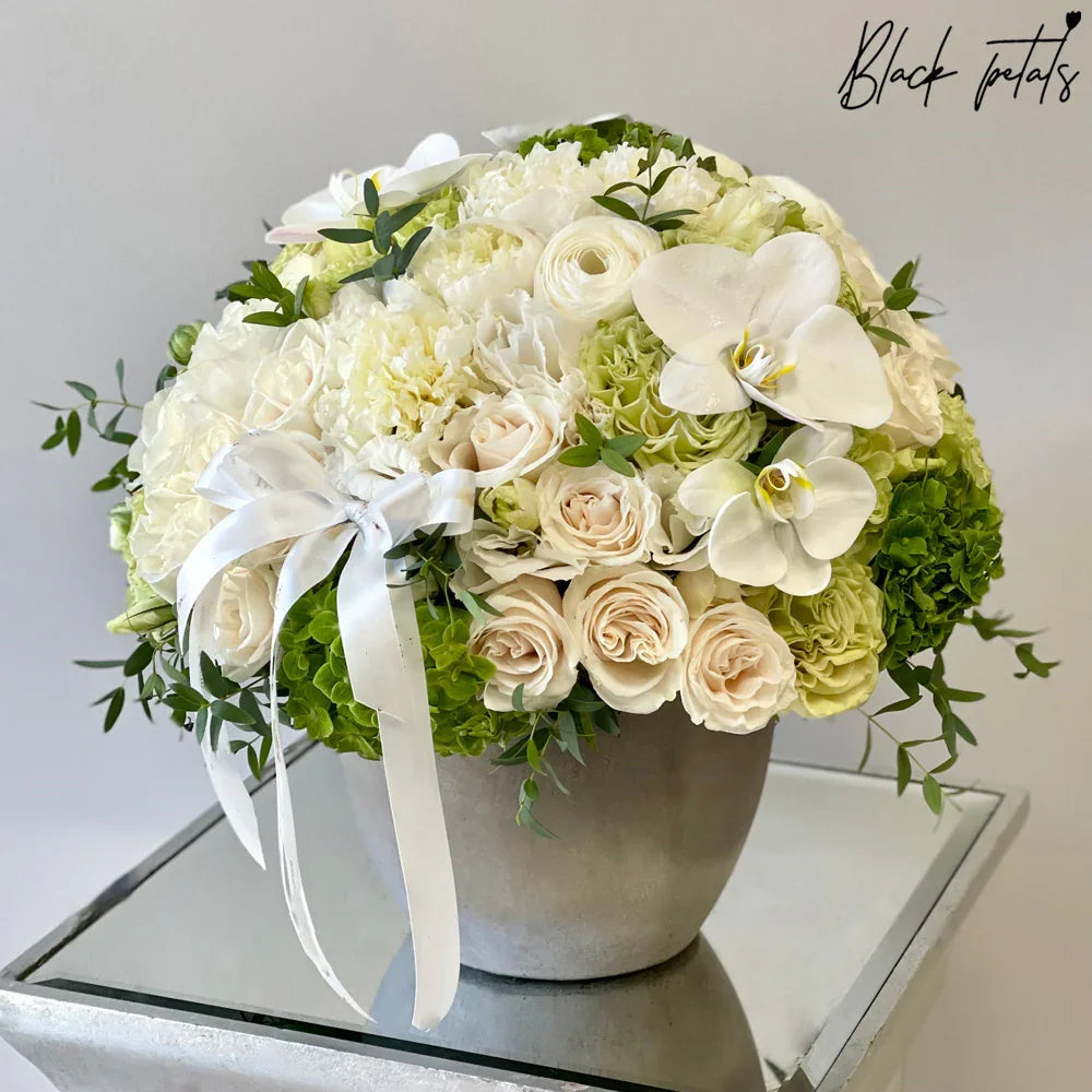 Green hydrangea and roses are paired with lush peonies, ranunculus, lisianthus and topped with white orchids tying everything together in this creation. Arrangement includes: