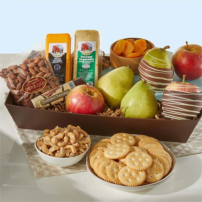 Your recipient will appreciate the balance of wholesome fruits and indulgent treats, all beautifully arranged in an elegant tray.