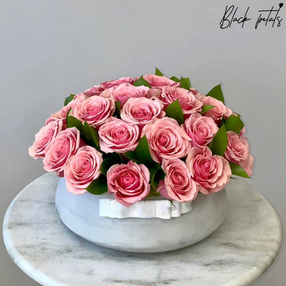 Beautiful Geraldine roses are dazzling in this ceramic pot in addition to lush gardenia leaves creating an elegant masterpiece. Arrangement includes: