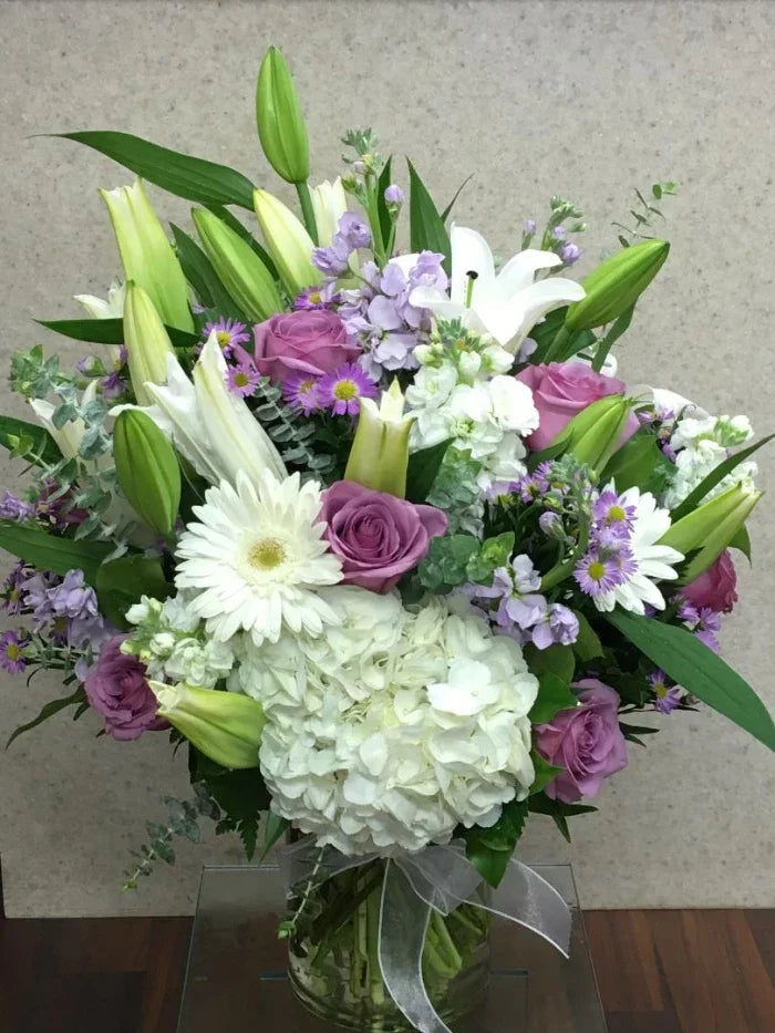 Hint Of Lavender brings a soothing touch of sophistication to any space. This luxury flower arrangement combines delicate lavender hues with soft whites, creating a bouquet that feels calm, fresh, and inviting.