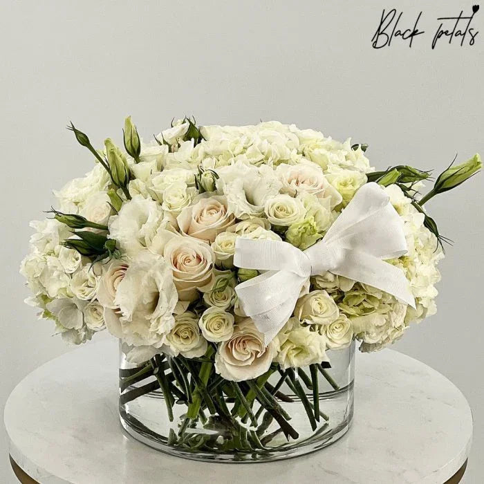 With the perfect amount of ivory tones and minimal greens, this delicately composed mixed arrangement is the perfect touch of blush for any space in your home.