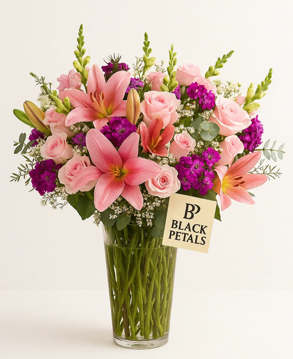 NEW A dazzling gathering of pink and purple, this bouquet will delight all the marvelous moms in your life. Our florists artistically arrange farm-fresh roses, Asiatic lilies, and other blooms to create a gift that expresses your love and appreciation in a way words never could.