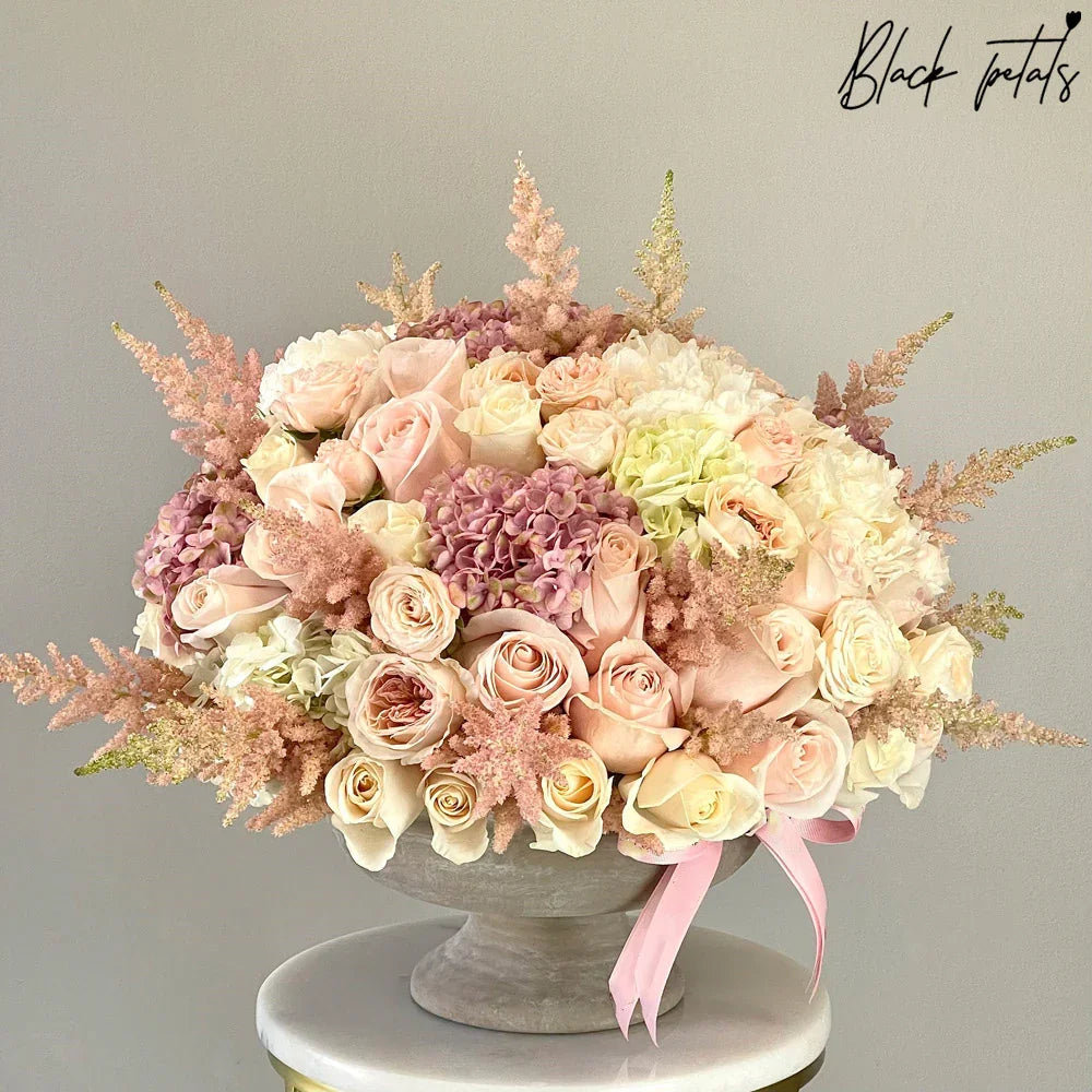 Blush and cream tones meet in this beautiful arrangement inspired by the gorgeous flowers along the streets of Melrose Avenue. Arrangement includes: