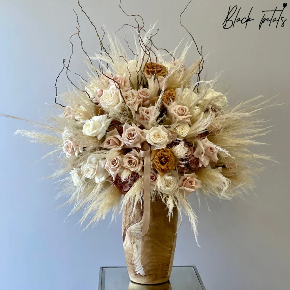 Created with a unique artistic design, our Pampas and Toffee arrangement is made of premium toffee and quicksand roses, antique hydrangeas, and pampas stems in the perfect wooden vase. These exquisite beige tones will definitely compliment any space! Arrangement includes: