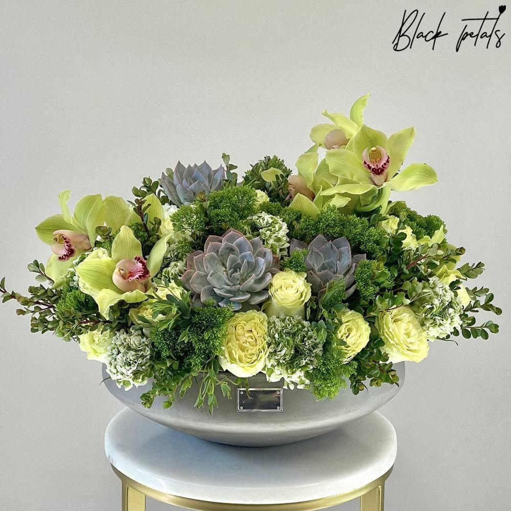Feel zen with our gorgeous green garden. These lovely hues will make your home feel peaceful and relaxed while still giving a pop of color. Arrangement includes: