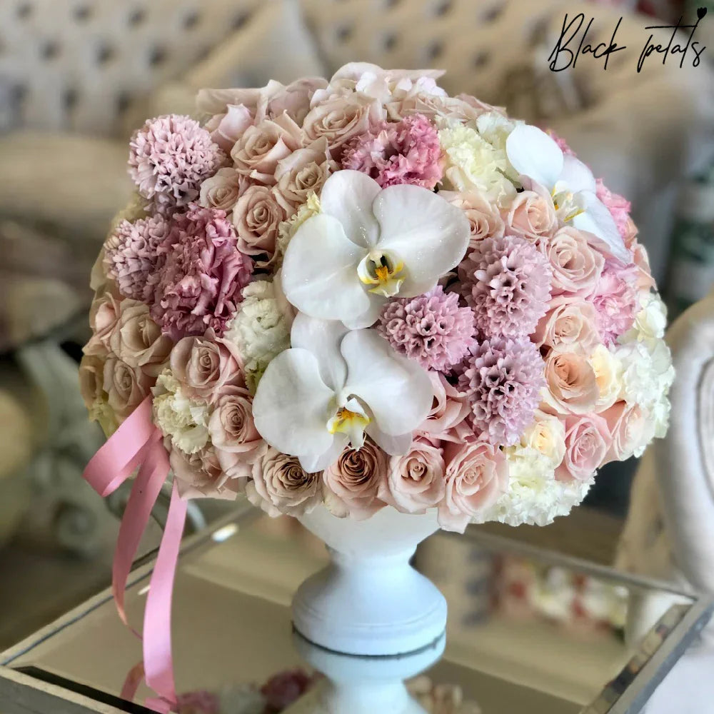 Pink Pearl is the ultimate blush arrangement to send to someone who loves these hues! Made of blush roses, hyacinth, lisianthus, hydrangeas and white phalaenopsis orchids, this is the ultimate arrangement to make someones day! Arrangement includes: