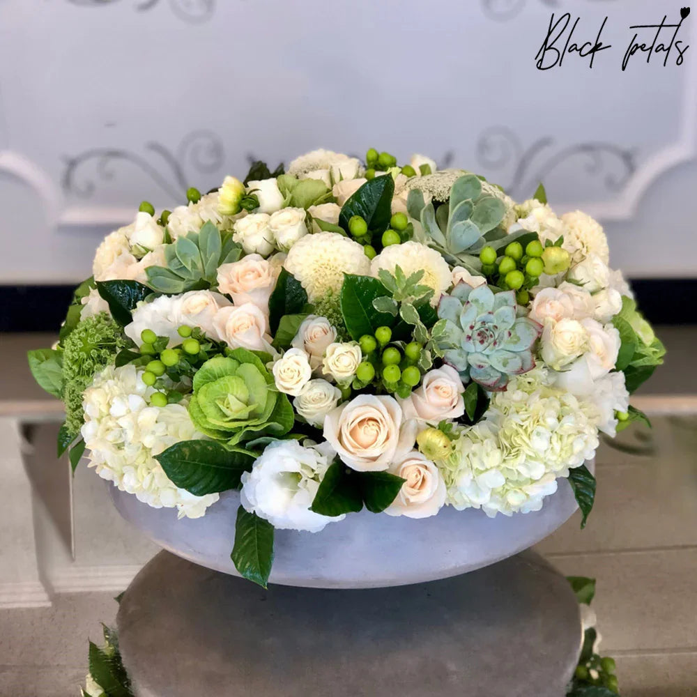 This beautiful ceramic vase is filled with succulents, roses, hydrangeas, kale flower, spray roses and accent greens creating our Urban Murano arrangement. perfect for your home or office! Arrangement includes: