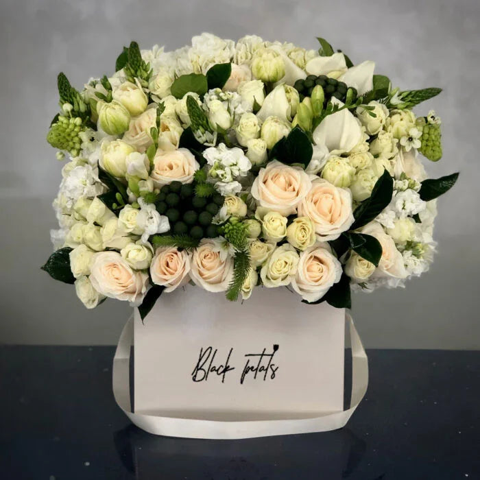 Each stem is carefully selected for its freshness and natural form. White roses, hydrangeas, and seasonal greens come together in a harmonious palette that soothes the eye and calms the spirit—just the right touch for an upscale Manhattan apartment or modern office space.