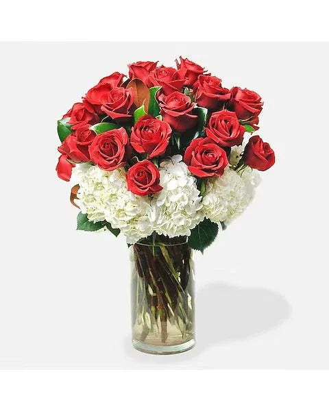 Elegant red roses are surrounded by a cloud of white hydrangeas, accented with magnolia leaves. Now this is the way to their heart!